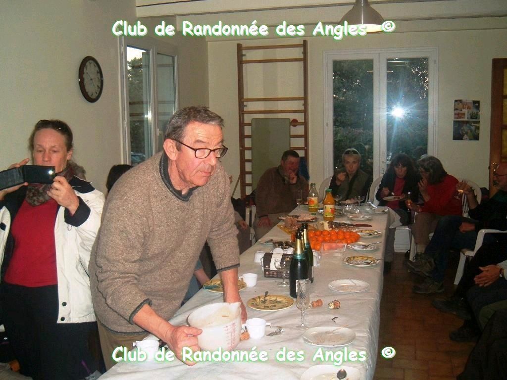 La tradition de l'association veut que nous dégustions la bûche de Noël à cette randonnée de l'année. L'un d'entre nous avait préparé dans son séjour une longue table entourée de chaises qui correspondaient au nombre de randonneurs. Nanny, prévenue par téléphone nous a apporté le chocolat chaud et découpé la bûche, un moment de convivialité apprécié par tous;