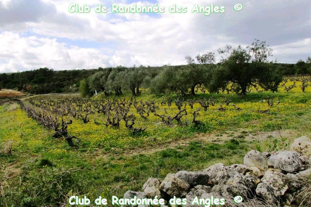 Le Colombier et ses maisons dans la lumière, ses ânes, ses oies, ses cygnes (dont certains noirs), ses chèvres, puis la forêt de Boussargues avant d’atteindre Cardignac que nous traversons en empruntant la D274 sur 800m avant de prendre sur la droite un sentier qui monte dans les cultures, puis en forêt jusqu’à Megiers. Là nous traversons la D 274 et nous arrêtons dans une clairière tapissée de fleurs jaunes, au soleil, à l’abris du vent face à des cerisiers en fleurs.