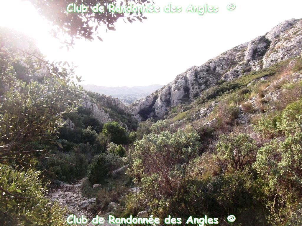 Pause déjeuner, puis là, le groupe se sépare en deux. Certains plongerons dans le vallon d’ou la vue sauvage est impressionnante. Les autres poursuivront sur le chemin pour attendre le premier groupe plus loin. La descente est rude, caillouteuse (nous rencontrerons deux amants enlacés), mais en bas le sentier remontera au bas des falaises, dans la forêt pour monter doucement en bord du vallon.