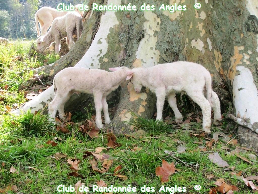 Arrivés au château, pont magnifique, grille en fer forgé 18°, chiens silencieux gardant le temple, dignes de Sphinx. Nous partons sur la Gauche en direction du Pigeonnier, architecture magnifique, bien planté, là, digne au milieu d’une prairie puis de la Chapelle Romane superbe et isolée, hélas fermée ! Mais dans le champ en face, récompense, de nombreuses congénères (des brebis) nous attendent avec tous leurs petits agneaux encore tétant leur mère ! Entre brebis, on a fait copain-copain !